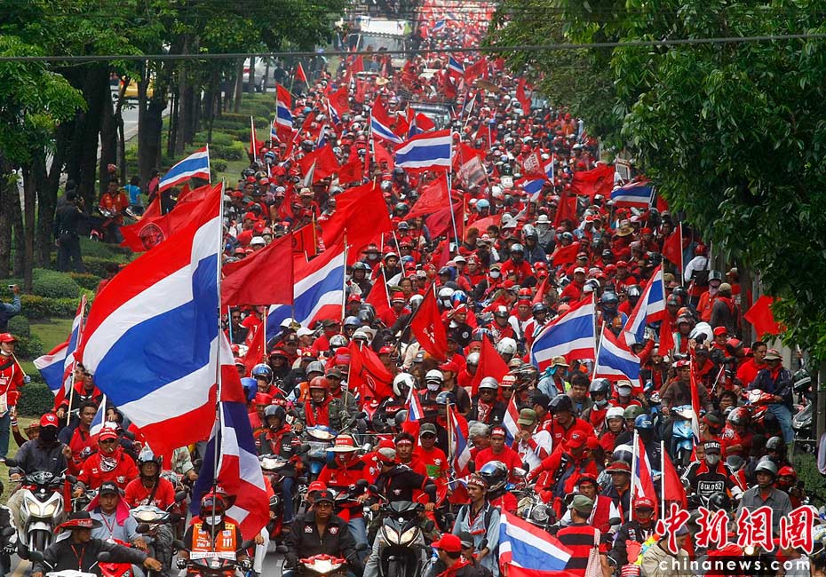 當地時間4月12日,泰國紅衫軍在曼谷市區抬著棺材舉行游行,借此向政府施壓促阿披實下臺。此前紅衫軍示威者與軍警發生沖突,造成21人死亡。圖片來源:中國新聞網