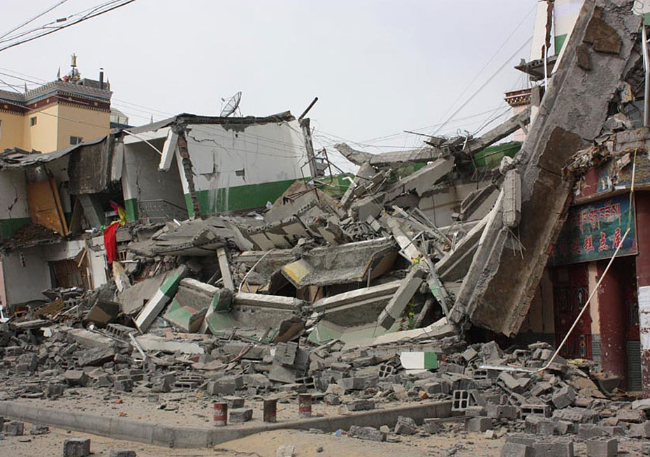 圖為4月14日拍攝的玉樹州結古鎮(zhèn)倒塌的房屋。圖片來源:新華網(wǎng) 吳宏 攝