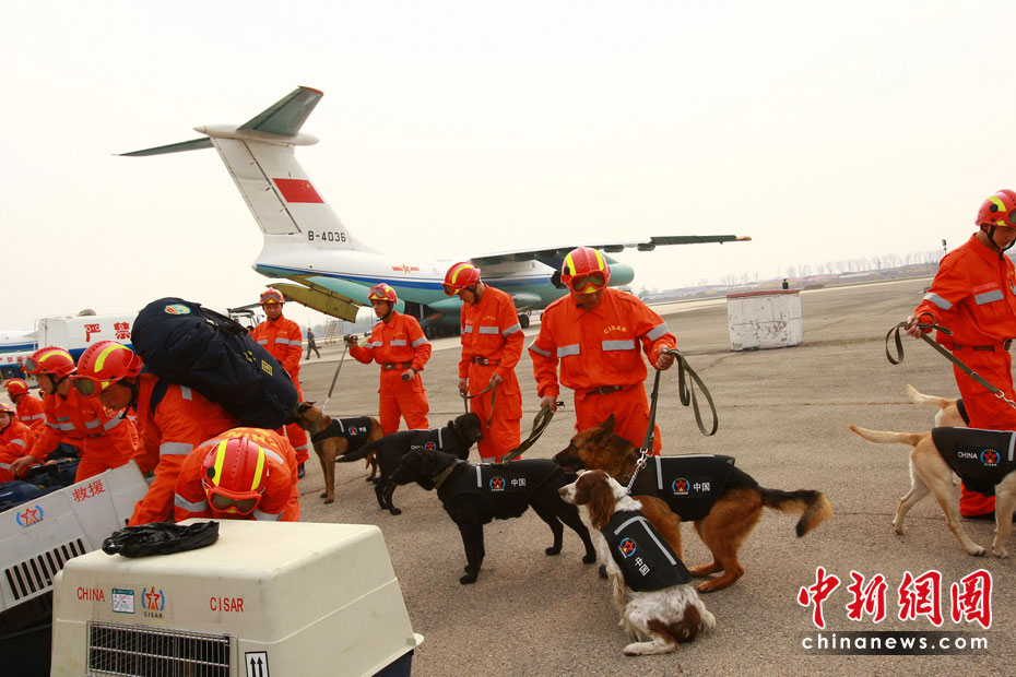圖為4月14日下午,中國國際地震救援隊(duì)攜帶重型搜救設(shè)備搭乘空軍專機(jī)趕赴青海玉樹震區(qū)。中新社發(fā) 譚超 攝