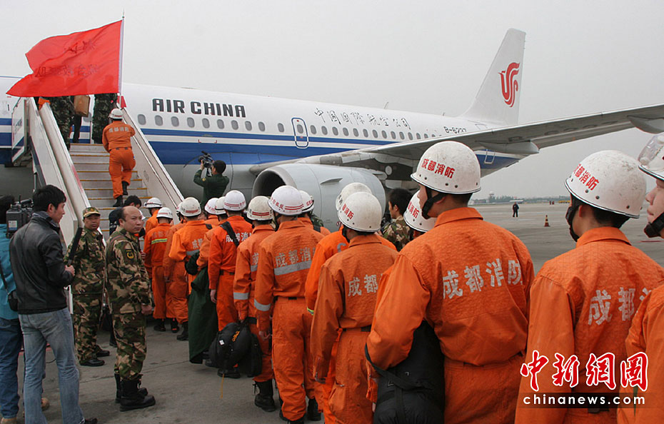 圖為4月14日18時(shí)02分和18時(shí)08分,國航西南分公司執(zhí)行緊急救援包機(jī)的一架空中客車A319和一架波音757飛機(jī)共搭載302名消防救災(zāi)人員和搜救設(shè)備從成都雙流機(jī)場起飛,火速趕往西寧,將前往青海玉樹7.1級地震震區(qū)救援。中新社發(fā) 易世忠 攝