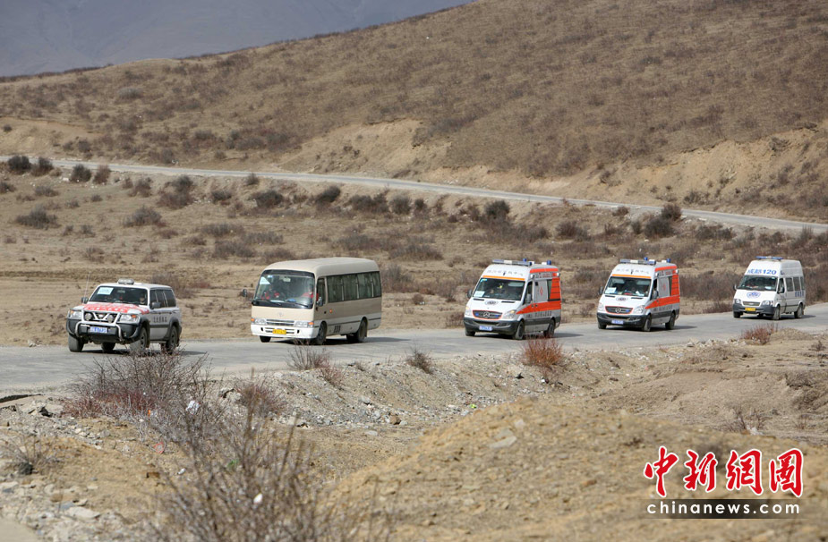 4月16日,四川省衛(wèi)生廳從成都派出首支國家醫(yī)療救援隊經過1200余公里,40小時的長途跋涉,醫(yī)療救援車隊平安抵達青海省玉樹地震重災區(qū)。圖為醫(yī)療車隊正在翻越海拔5000多米的海子山。中新社發(fā) 劉忠俊 攝