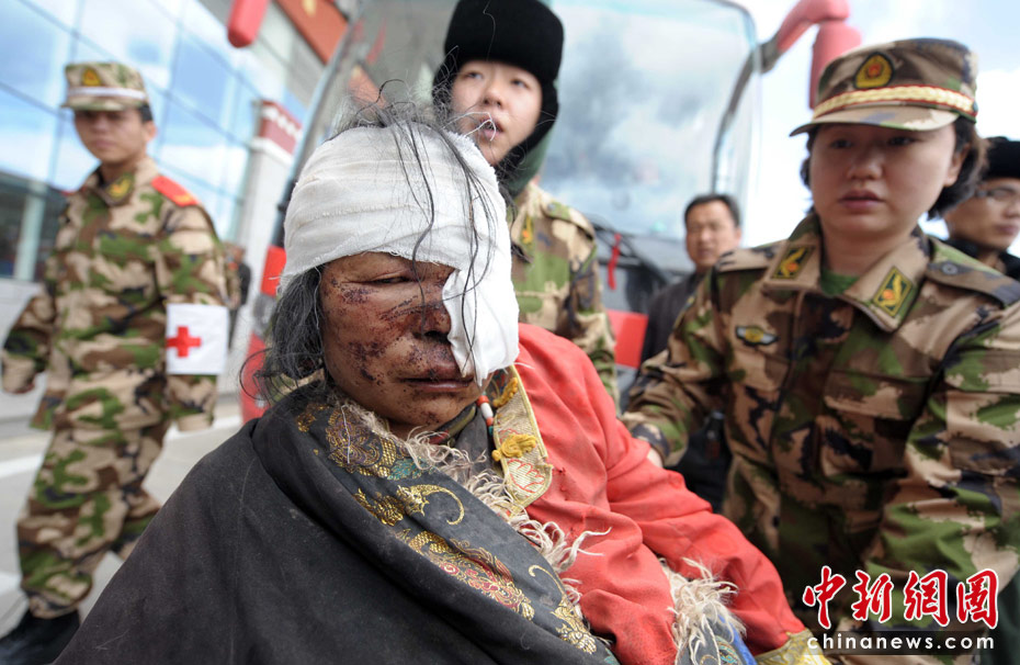 圖為4月15日下午,玉樹(shù)地震重傷員用各種交通工具送達(dá)機(jī)場(chǎng),廣東邊防總隊(duì)醫(yī)療救援隊(duì),用被褥接轉(zhuǎn)傷員。中新社發(fā) 陳文 攝