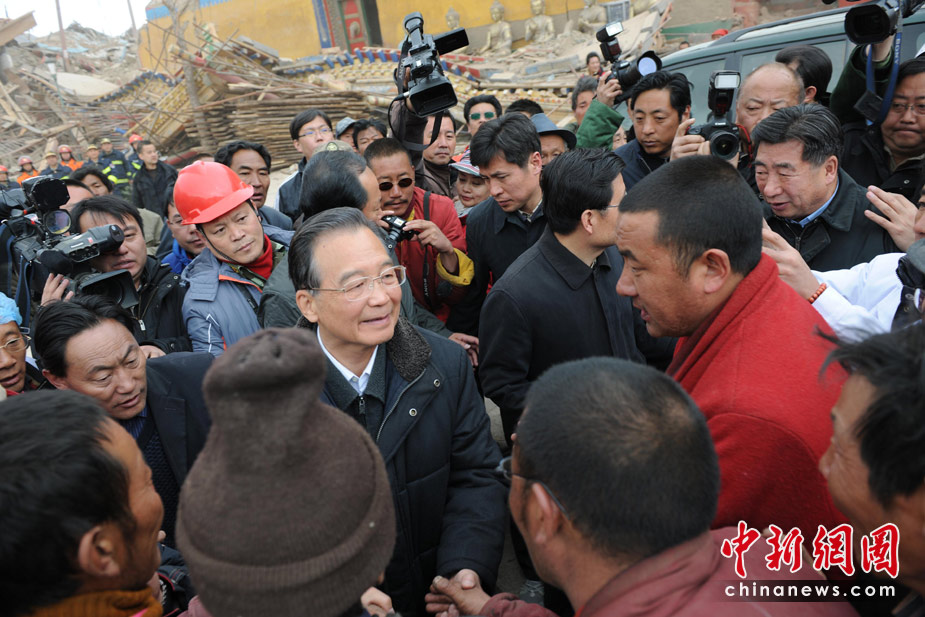 4月16日上午,中國國務(wù)院總理溫家寶來到距離玉樹縣城約10公里的禪古寺,看望受災(zāi)僧侶和民眾。溫家寶表示,只要有一線希望,就將盡最大努力救援,他還慰問了正在現(xiàn)場實施挖掘救援的工作人員。中新社發(fā) 符永康 攝