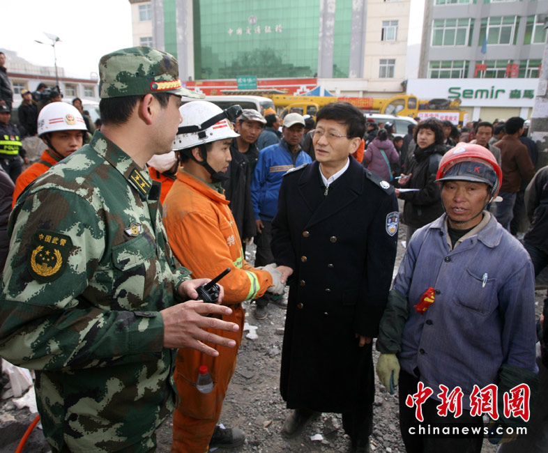 2010年4月16日10時許,國務委員、公安部部長孟建柱來到青海省玉樹藏族自治州玉樹縣地震災區四川消防部隊玉樹教育局救援現場,詢問救援情況,并看望慰問消防官兵。4月14日07時49分許,青海省玉樹藏族自治州玉樹縣(北緯33.1,東經96.7)發生7.1級地震。中新社發 劉忠俊 攝
