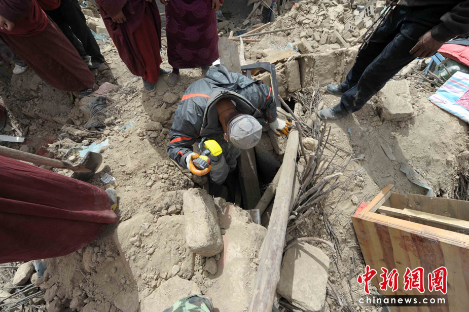 4月16日,青海玉樹地震救援進入第三天,來自蘭州軍區、山東消防特勤、重慶特勤、廣東邊防總隊、云南邊防總隊、青海民兵等搜救隊連續搜救,幸存者奇跡生還。中新社發 陳文 攝