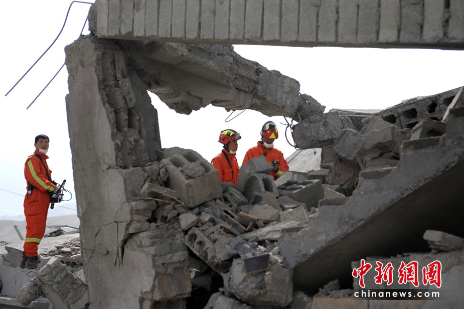4月16日,青海玉樹地震救援進入第三天,來自蘭州軍區、山東消防特勤、重慶特勤、廣東邊防總隊、云南邊防總隊、青海民兵等搜救隊連續搜救,幸存者奇跡生還。中新社發 陳文 攝