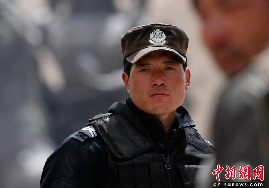 2010年4月16日,青海玉樹藏族自治州玉樹縣結古鎮格薩爾王廣場,一名警察正在執勤。中新社發 盛佳鵬 攝