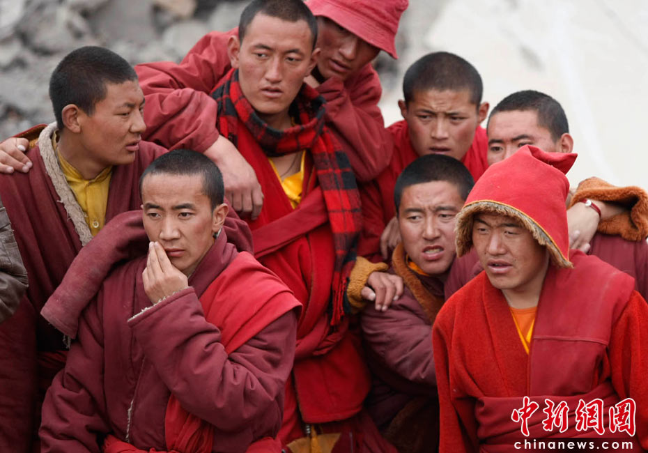 4月16日,青海玉樹結(jié)古鎮(zhèn)震災(zāi)救援現(xiàn)場(chǎng),當(dāng)?shù)厣畟H在救援現(xiàn)場(chǎng)關(guān)注進(jìn)展情況。中新社發(fā) 盛佳鵬 攝