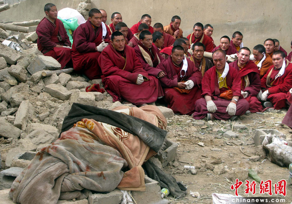 4月16日,青海玉樹震區僧侶們在廢墟邊為地震遇難者按藏族習俗進行超度。中新社發 孫自法 攝
