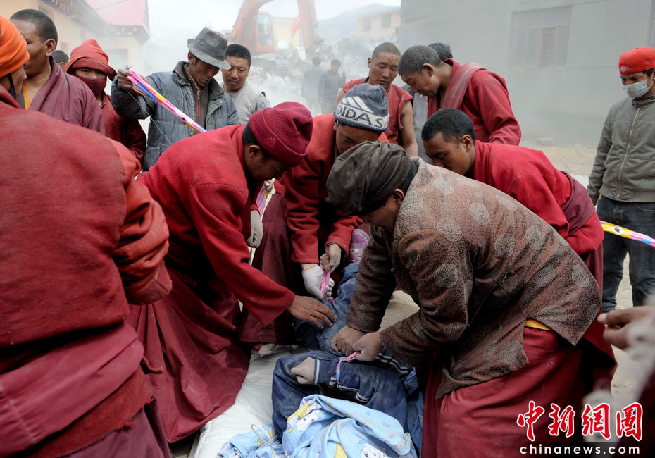 4月16日,青海玉樹民族師范學校坍塌的女生宿舍樓內,僧侶們正在協助救援人員挖掘遇難者遺體。中新社發 廖攀 攝