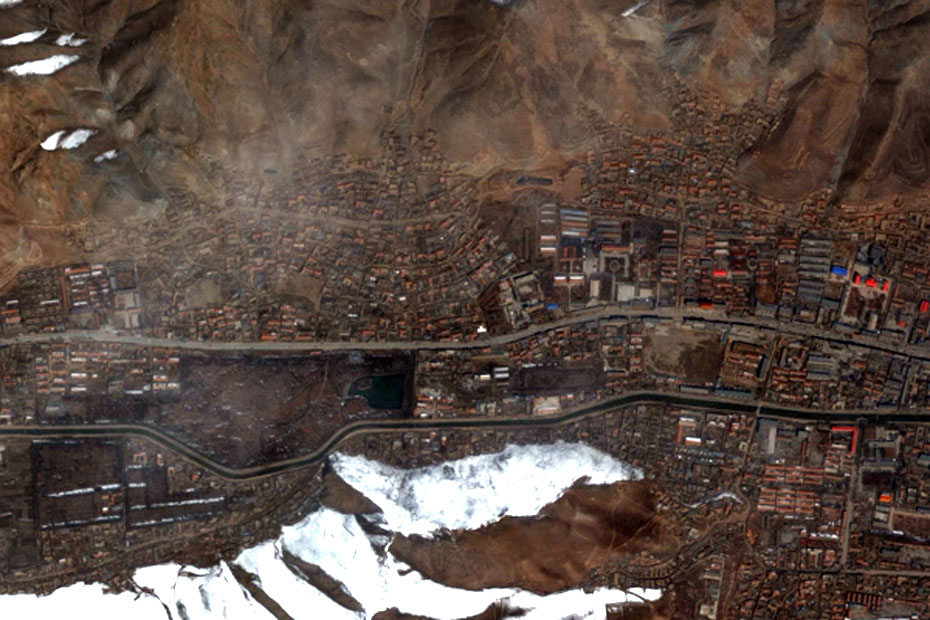 利用對地觀測中心2010年4月16日獲取的高分辨率航空遙感數據,提取出玉樹州結古鎮城區范圍內地震破壞最嚴重或典型地區,使之與GoogleEarth中相應位置的震前遙感衛星數據進行對比,直觀展現結古鎮在此次地震中的受影響程度。圖片來源:中國科學院