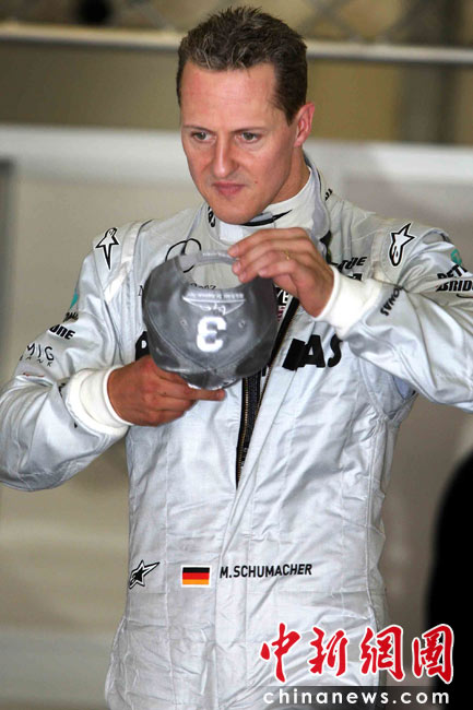 圖為梅賽德斯GP車隊DE舒馬赫在練習(xí)賽后按照規(guī)則稱量體重。中新社記者 任晨鳴 攝