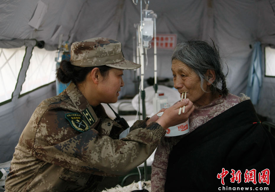總后青藏兵站部抗震救災醫療隊目前在玉樹災區開展救治工作,已收治重癥傷病員48名,實施手術9例。醫療隊到達玉樹結古鎮后,迅速設立野戰醫院,展開救治工作。在得知西同路附近還有大批傷員急需救治后,又迅速派出救護車進行就診。圖為醫療人員精心護理傷員。中新社發 鄒小慶 攝