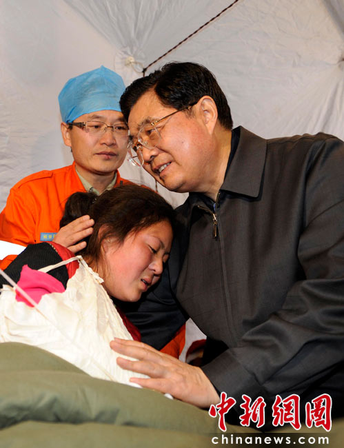 4月18日,中共中央總書記、國家主席、中央軍委主席胡錦濤來到青海玉樹體育場地震災民安置點看望受災民眾和醫務人員。中新社發 廖攀 攝