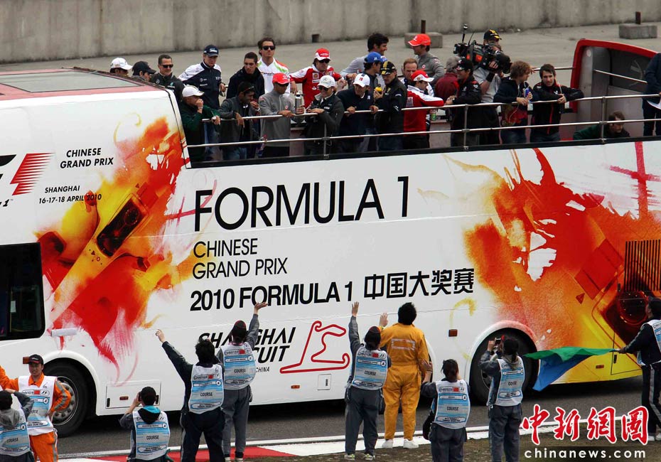 4月18日下午,2010國(guó)際汽聯(lián)F1世界錦標(biāo)賽上海站在上海國(guó)際賽車場(chǎng)舉行正式比賽,賽前24名參賽車手按照慣例乘坐敞篷車環(huán)繞賽場(chǎng)一周與車迷見(jiàn)面,但是寥寥無(wú)幾的觀眾與陰沉的天氣使上海F1賽事創(chuàng)下開賽七年以來(lái)觀眾人數(shù)最低的紀(jì)錄。中新社記者 任晨鳴 攝