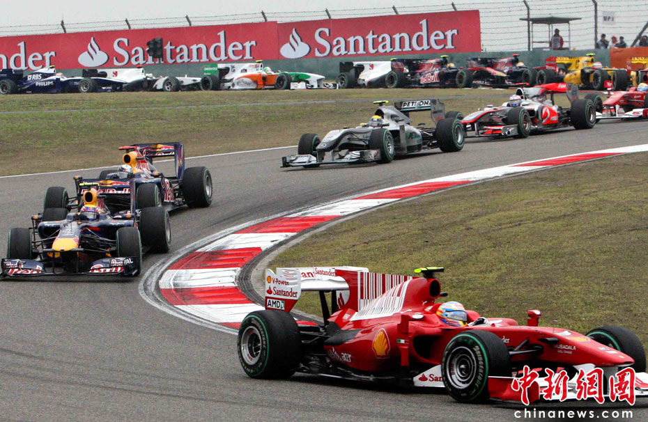 圖為法拉利車隊(duì)的西班牙車手阿隆索起跑神速超越兩名紅牛車手位居第一,但因“搶跑”受到處罰。中新社記者 任晨鳴 攝
