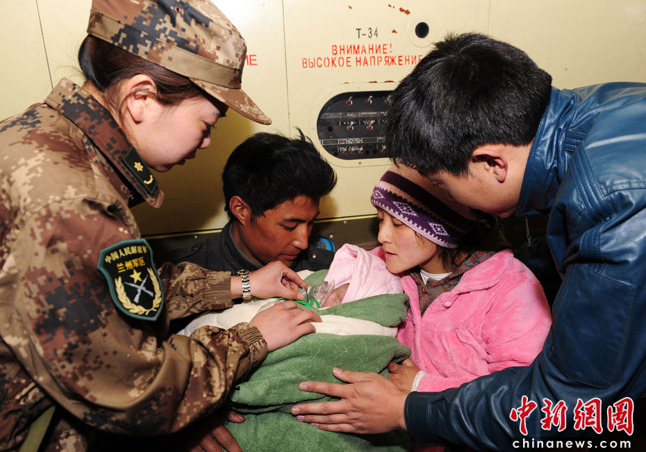 4月18日上午9點10分,剛剛到達(dá)玉樹機(jī)場正在卸下救災(zāi)物資的廣空運(yùn)輸航空兵某師劉軍機(jī)組,聽說有名早產(chǎn)兒急需轉(zhuǎn)送蘭州軍區(qū)總醫(yī)院救治,僅用15分鐘準(zhǔn)備,9點25分飛機(jī)提前起飛。懷孕8個多月藏族婦女尼瑪拉毛,由于地震驚嚇導(dǎo)致早產(chǎn)。當(dāng)日凌晨4點轉(zhuǎn)院途中,在蘭州軍區(qū)323醫(yī)院婦產(chǎn)醫(yī)生王小特、盧小娟的幫助下,產(chǎn)下一男嬰。由于早產(chǎn)、產(chǎn)程長,嬰兒嚴(yán)重缺氧,發(fā)生紫疳,為了盡快挽救嬰兒生命,準(zhǔn)備轉(zhuǎn)往蘭州軍區(qū)總醫(yī)院。圖為蘭州軍區(qū)323醫(yī)院救護(hù)隊員隨機(jī)救護(hù)。中新社發(fā) 沈玲 攝