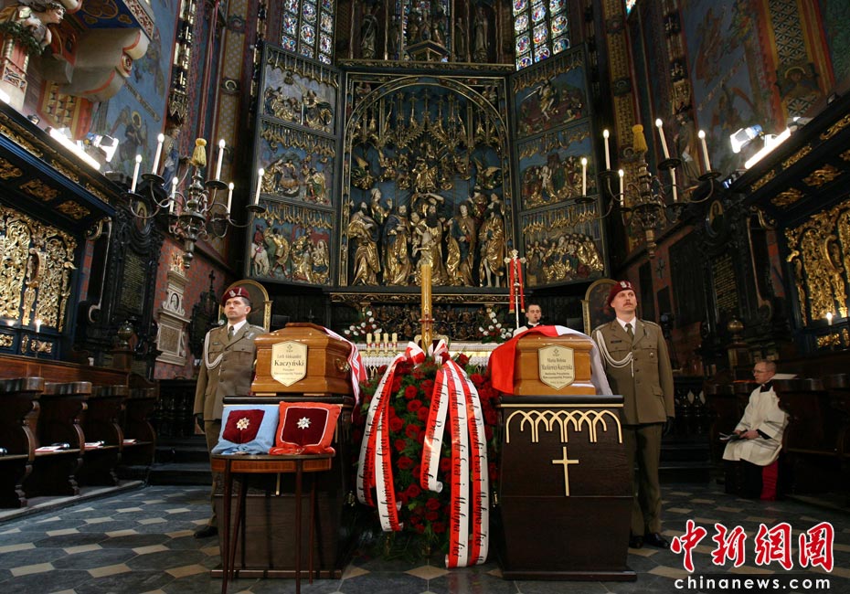當地時間4月18日,卡欽斯基夫婦的葬禮在波蘭南部城市克拉科夫舉行。波蘭總統卡欽斯基及其夫人乘坐的專機10日在俄羅斯斯摩棱斯克失事,機上人員全部遇難。圖片來源:中國新聞網