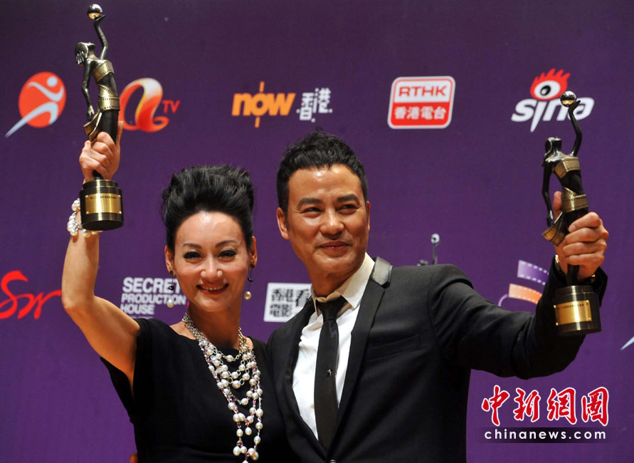 4月18日晚,“第二十九屆香港電影金像獎(jiǎng)”頒獎(jiǎng)典禮在香港文化中心大劇院隆重舉行。分別奪得最佳男女主角獎(jiǎng)項(xiàng)的香港藝人任達(dá)華及惠英紅向媒體展示獎(jiǎng)項(xiàng)并合照。中新社發(fā) 鄧慶樂 攝