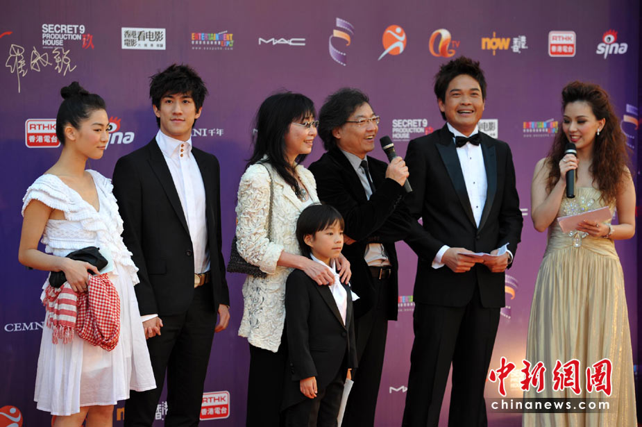 4月18日,參加第29屆香港電影金像獎(jiǎng)?lì)C獎(jiǎng)典禮的舒淇、何超儀、林熙蕾、楊千女華、梁詠琪、劉家良、張家輝、張震、曾志偉、錢(qián)嘉樂(lè)、關(guān)錦鵬、余文樂(lè)、吳彥祖、馮德倫、阮經(jīng)天、趙又廷、許志安、黃子華等明星,在粉絲的歡呼聲中、在媒體記者追逐中,正踏上紅地毯步入香港文化中心大劇院。城中盛事“金像獎(jiǎng)?lì)C獎(jiǎng)典禮”在這舉行。圖為《歲月神偷》導(dǎo)演與主要角色。中新社發(fā) 鄭祚聲 攝