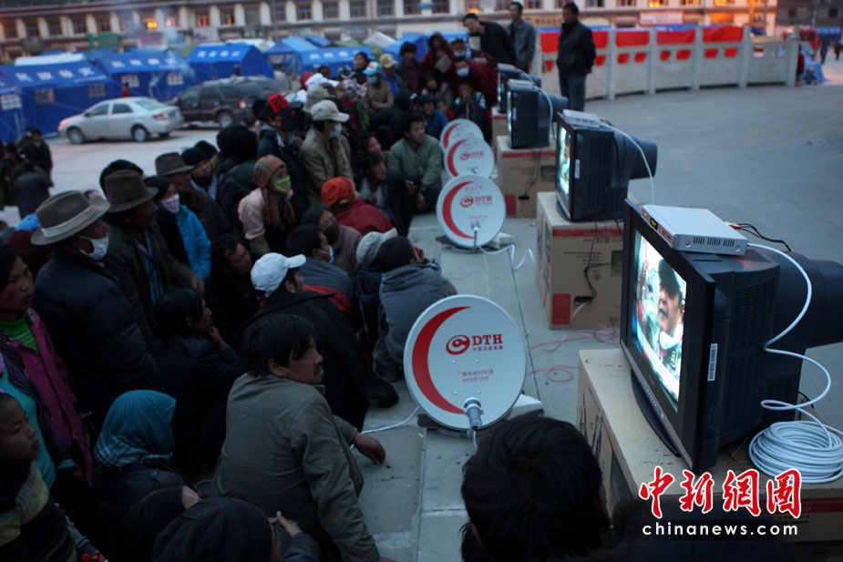 4月18日,青海玉樹結古鎮格薩爾王廣場,青海玉樹廣電系統為受災民眾安裝了4臺電視機,直播震災救援的最新進展。中新社發 盛佳鵬 攝