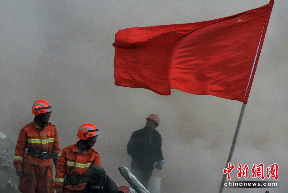 4月中旬青海玉樹地震災區風沙迷漫,各地救援隊在結古鎮災區煙塵中堅持抗震救災。中新社發 賈國榮 攝