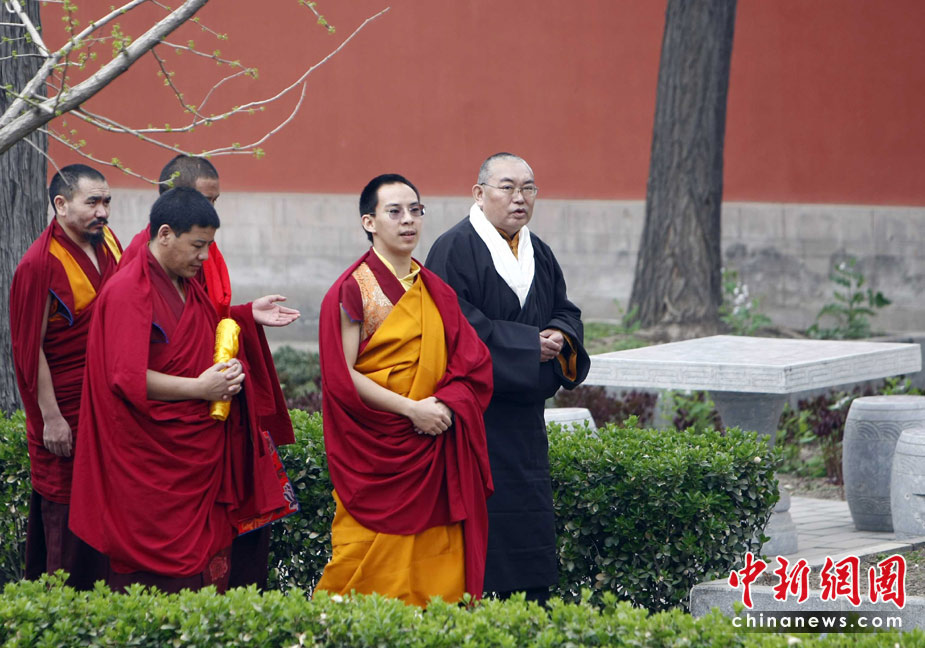 4月20日上午9時許,十一世班禪額爾德尼·確吉杰布和嘉木樣活佛在北京西黃寺,為青海玉樹地震遇難同胞舉行超度法會。中新社發(fā) 杜洋 攝