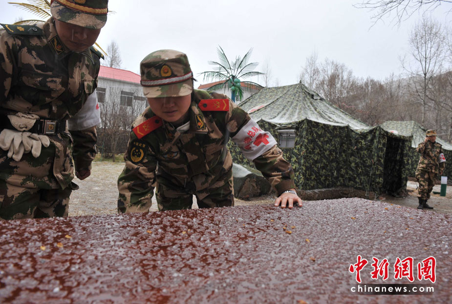 4月20日12時許,玉樹地震災區突然雷雹交加,給青海武警總隊醫療救護隊治療抗震救災傷員造成困難。中新社發 賈國榮 攝