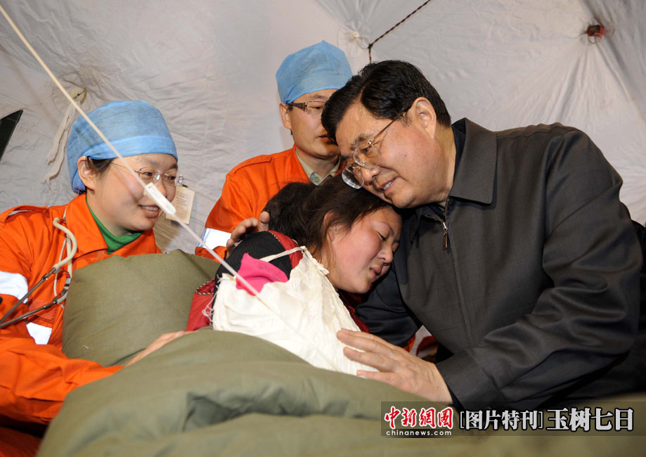 4月18日,中共中央總書記、國家主席、中央軍委主席胡錦濤來到青海玉樹體育場地震災民安置點武警總醫院醫療隊看望受災民眾和醫務人員。中新社發 廖攀 攝