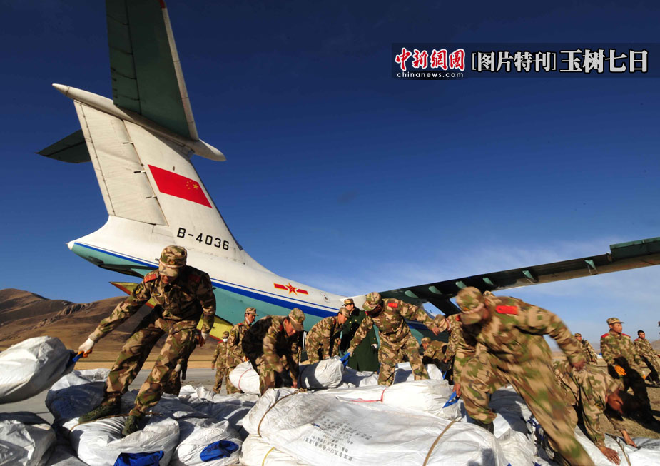4月17日凌晨6點(diǎn)開(kāi)始,空軍緊急出動(dòng)飛機(jī)8架,飛行8架次,截止到中午12點(diǎn),共運(yùn)送帳篷1080頂,救災(zāi)器材20噸,野戰(zhàn)食品24噸,共計(jì)158噸。據(jù)玉樹(shù)氣象臺(tái)預(yù)報(bào),災(zāi)區(qū)當(dāng)日下午到夜間有陣雨,19日白天至夜間有小到中雪,氣溫將降到零度以下。中新社發(fā) 沈玲 攝