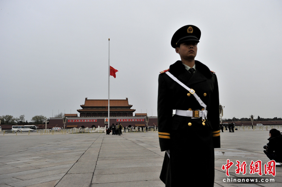 4月21日早晨,北京天安門廣場下半旗向玉樹地震遇難者致哀。中新網記者 金碩 攝
