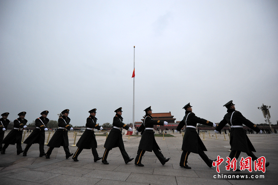 4月21日早晨,北京天安門廣場下半旗向玉樹地震遇難者致哀。中新網(wǎng)記者 金碩 攝