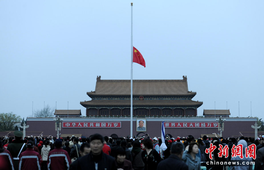 4月21日,北京天安門廣場升國旗儀式結(jié)束后,下半旗向玉樹地震遇難同胞志哀。為表達全國各族人民對青海玉樹地震遇難同胞的深切哀悼,中國國務(wù)院決定,舉行全國哀悼活動,全國和駐外使領(lǐng)館下半旗志哀,停止公共娛樂活動。中新社發(fā) 劉震 攝