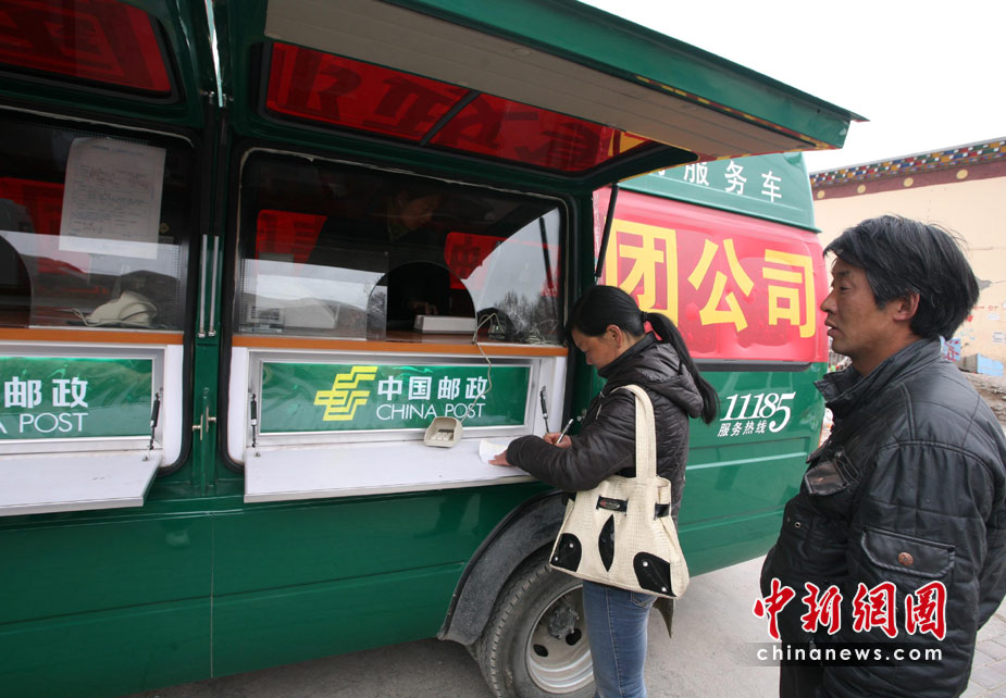 4月20日,寧夏郵政抗震救災突擊隊六輛全電子移動郵政業(yè)務車開進玉樹地震災區(qū),開始受理市民信函、金融等業(yè)務辦理,目前玉樹城內(nèi)已有多家銀行機構(gòu)和商業(yè)網(wǎng)點開始恢復營業(yè)。圖為玉樹街頭市民正在排隊辦理郵政業(yè)務。中新社發(fā) 劉忠俊 攝