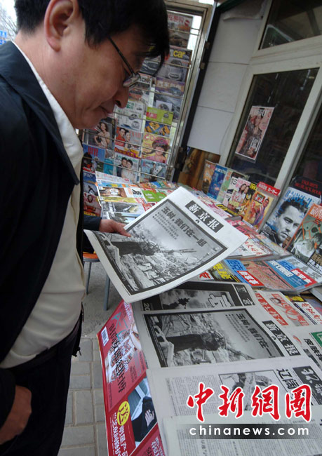 4月21日,按照中國國務(wù)院決定,舉行全國哀悼活動(dòng),全國和駐外使領(lǐng)館下半旗志哀,停止公共娛樂活動(dòng)。當(dāng)日北京各家報(bào)社刊出悼念玉樹地震遇難同胞特刊,并撤銷了一切彩色圖片和字頭,采用黑白版面。中新社發(fā) 鄒憲 攝
