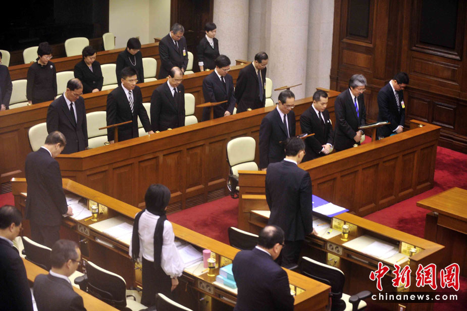 香港立法會4月21日繼續辯論財政預算案撥款條例草案,立法會主席曾鈺成在預算案辯論開始前,帶領全體議員及與會官員一同肅立,為青海地震死難者默哀。中新社發 譚達明 攝