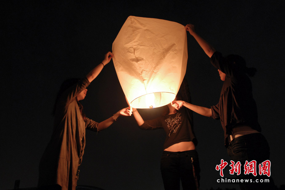 4.21全國哀悼日晚上,廣東外語外貿大學的學生們在廣州大學城內點燃孔明燈,為玉樹地震災區人民祈福。 中新社發 龍宇陽 攝