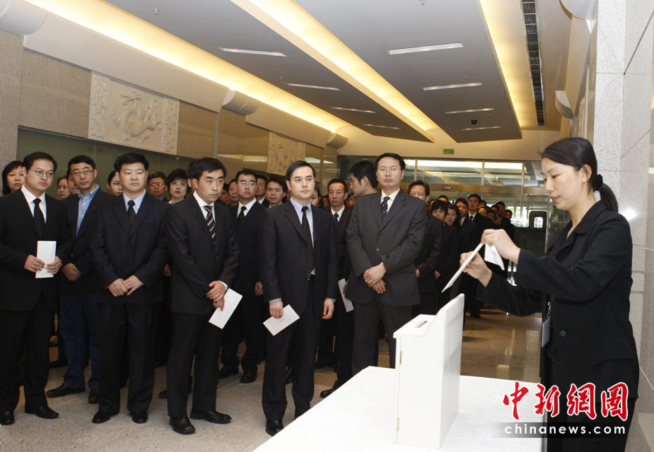 當(dāng)?shù)貢r(shí)間4月21日,中國(guó)駐紐約總領(lǐng)館舉行儀式,沉痛悼念青海玉樹地震遇難同胞。圖為悼念儀式后,中國(guó)駐紐約總領(lǐng)事館全體工作人員為青海玉樹捐款。中新社發(fā) 魏晞 攝