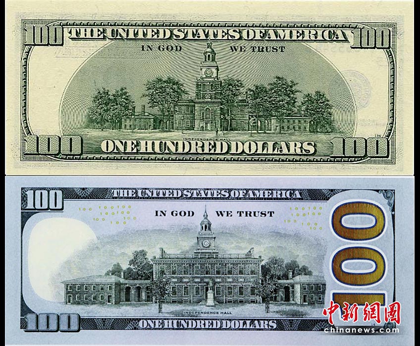 4月21日,美國財政部和美聯儲共同發布新版100美元面值的紙幣票樣。此次發行新版百元美鈔旨在防范假鈔,同時,老版美元仍將繼續流通。圖片來源:中國新聞網