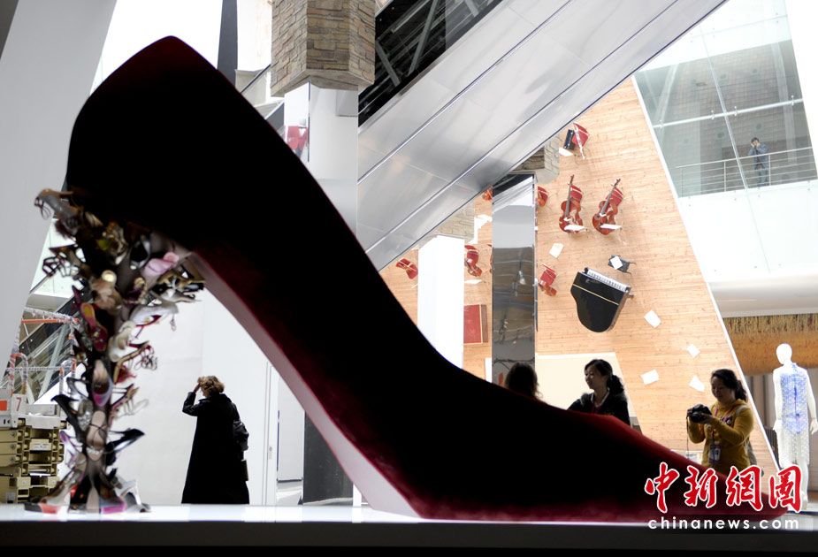 4月27日,一位外國女士走過上海世博園意大利館內的高跟鞋展品。中新社發 廖攀 攝