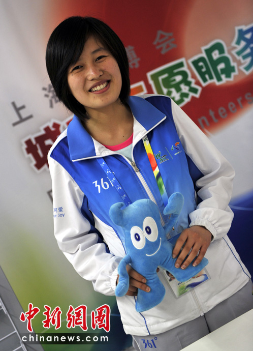 小郭姑娘很熱情地幫助過往的路人,但面對鏡頭的時候卻十分靦腆,不過還是很配合地與海寶合影,并亮出了“志愿者的微笑”。小郭說,作為志愿者,要“齊心協力,心系世博”,并表示盼望世博會能夠精彩難忘。