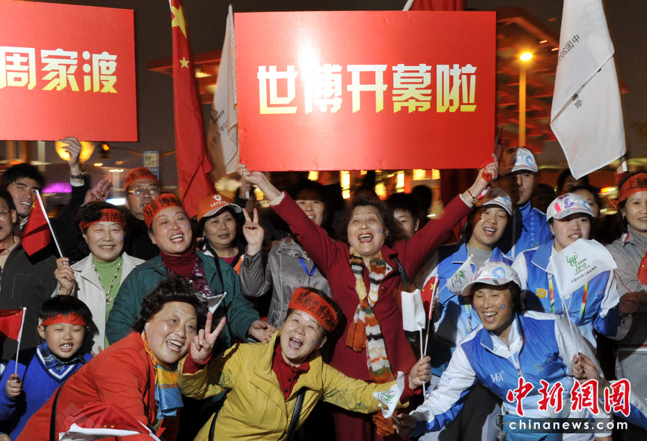 4月30日,上海世博會開幕,黃浦江畔火樹銀花姹紫嫣紅,這座夢想成真城市的千萬居民,在這個注定難忘的夜晚盡情燃燒和釋放著自己的激情。上海周家渡動遷居民和志愿者在中國館前打出“世博開幕啦”的大牌子,高喊:“世博開幕啦!我們開心死啦!”中新網記者 王紅綱 攝