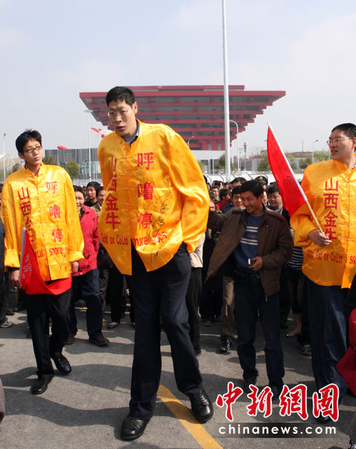 5月1日,三位平均身高2.30米以上的中國巨人到上海世博園區參觀中國館,吸引了眾多游客好奇的目光。當日,上海世博會正式開園。中新社發 湯彥俊 攝