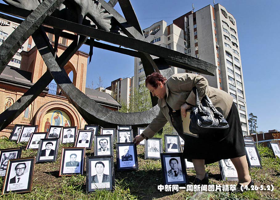 26日(周一),一名婦女在基輔紀念切爾諾貝利爆炸中死亡的丈夫。當日烏克蘭等國紀念切爾諾貝利核泄漏事故24周年。