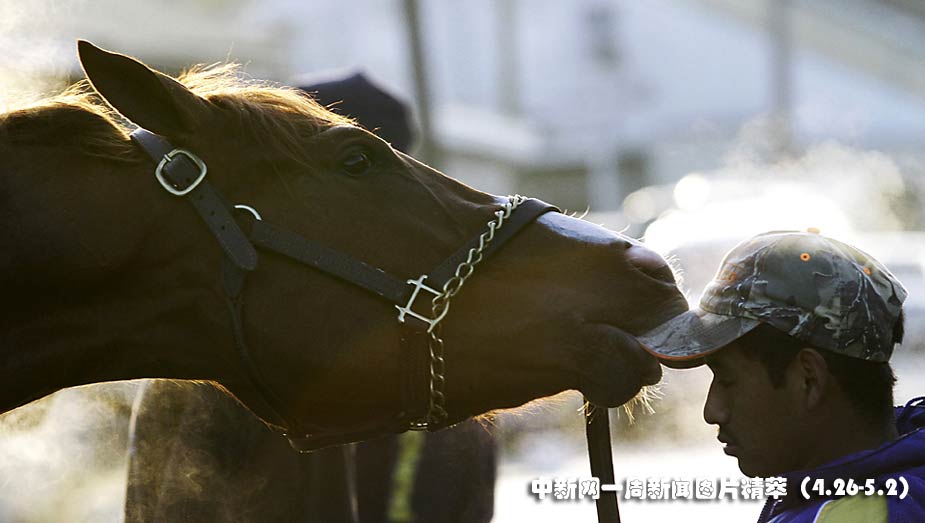 28日(周三),在肯塔基州路易斯維爾的邱吉爾唐斯,一匹馬在啃咬馬夫的帽子。