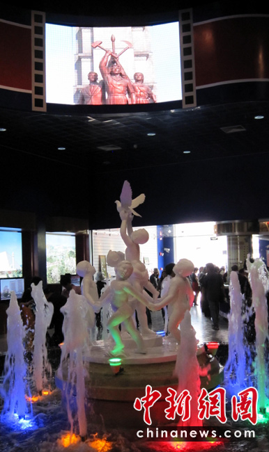5月2日,上海世博會開園第二天,首次參展世博會的朝鮮館迎來人潮。圖為朝鮮館內噴泉涌動,大屏幕上播放著介紹平壤主要景點的影片。中新社發 姜煜 攝