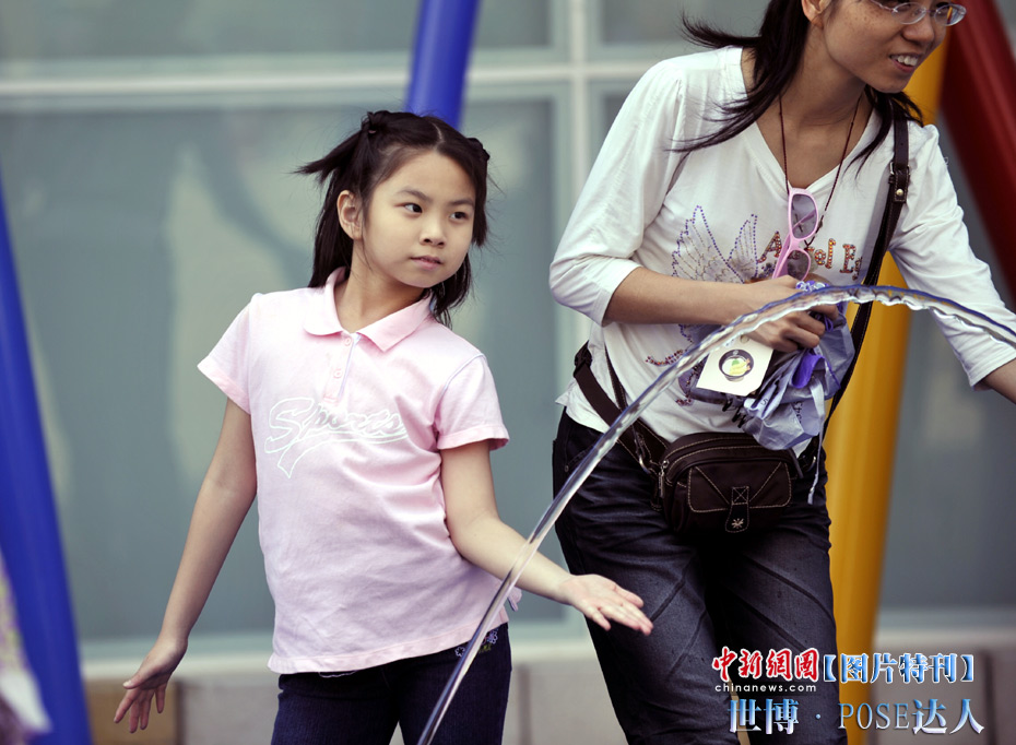 逛世博一定會拍照留念,擺一個漂亮有創意的pose尤為重要。面對著鏡頭,挺胸收腹翹臀,一個微笑,一個手勢,秀出自己的活力。心中一定要默念:“我留下的不是照片,是心情!”S型的pose不僅是芙蓉姐姐的專用。中新網記者 王紅綱 攝