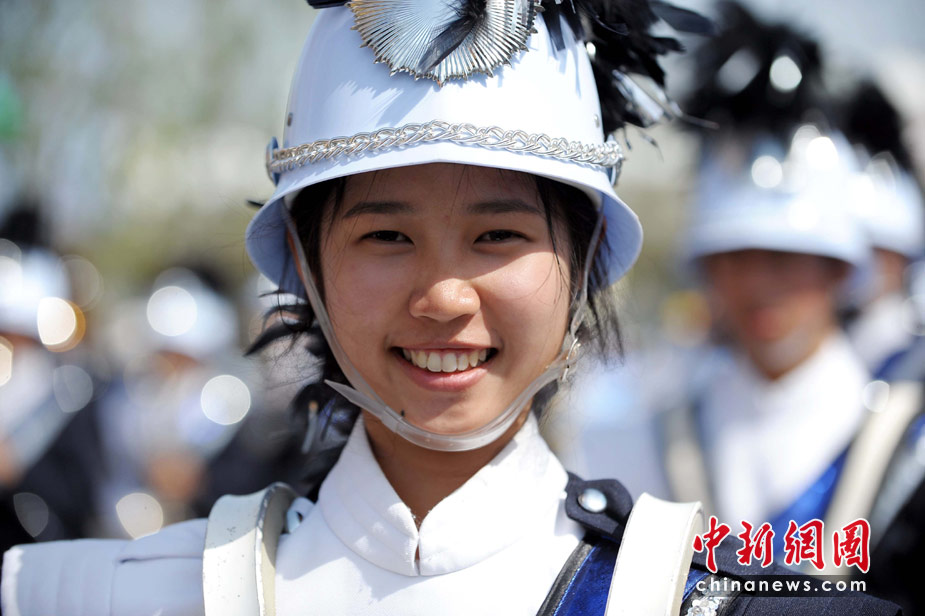來自泰國南邦甘拉雅尼步操樂團的美少女,在上海世博會園區舉行的“歡樂盛裝大巡游”中引人注目。中新社發 陳文 攝