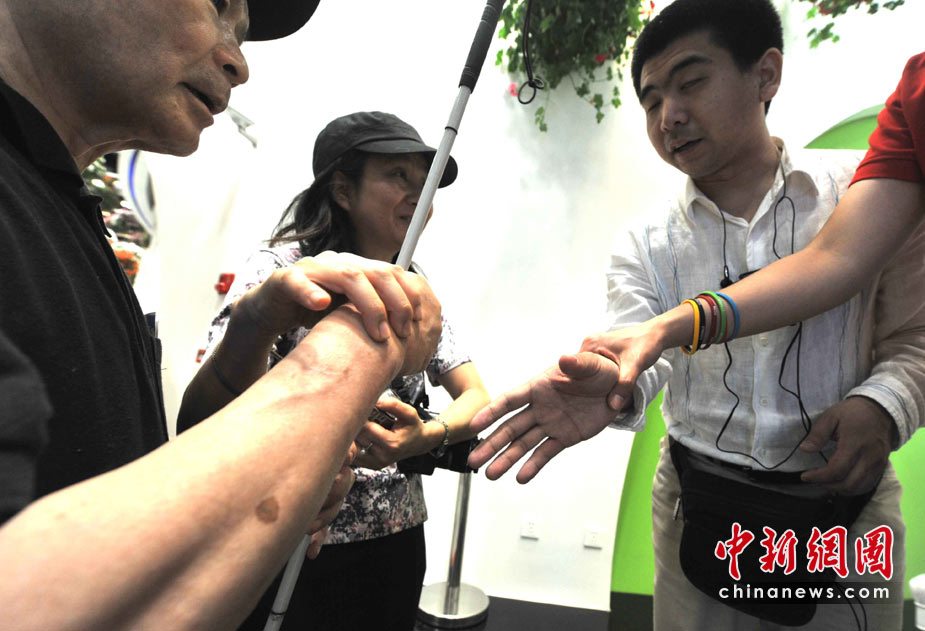 5月4日是上海世博會第四天,盲人鋼琴家孫巖在生命陽光館專設區域為眾多殘疾人和觀眾演奏,導盲犬靜臥在他的腳邊,這是世博會歷史上第一次為殘疾人設館。孫巖2005年獲得“日本橫濱第一屆國際殘疾人鋼琴比賽”金獎,他是中央音樂學院有史以來第一位盲人大學生和研究生。他的傾情演奏感動全場,掌聲連連。一位日本盲人參觀者激動地上前致敬。 中新社發 賈國榮 攝