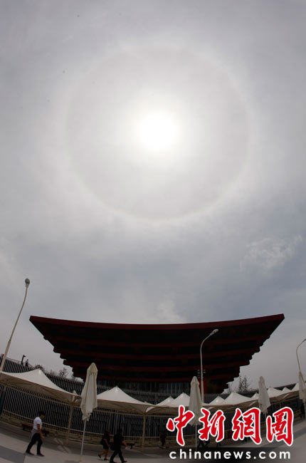 2010年5月4日,上海世博園區上空出現日暈,與中國國家館和尼泊爾館相映成趣。中新社發 盛佳鵬 攝
